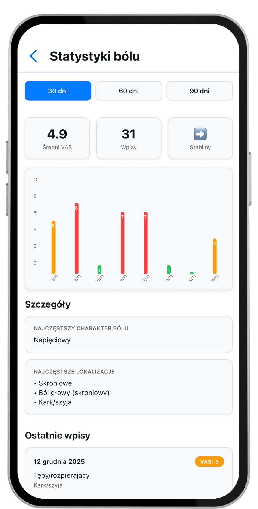 Pain is recorded using standardized scales and linked directly to reported behaviors.